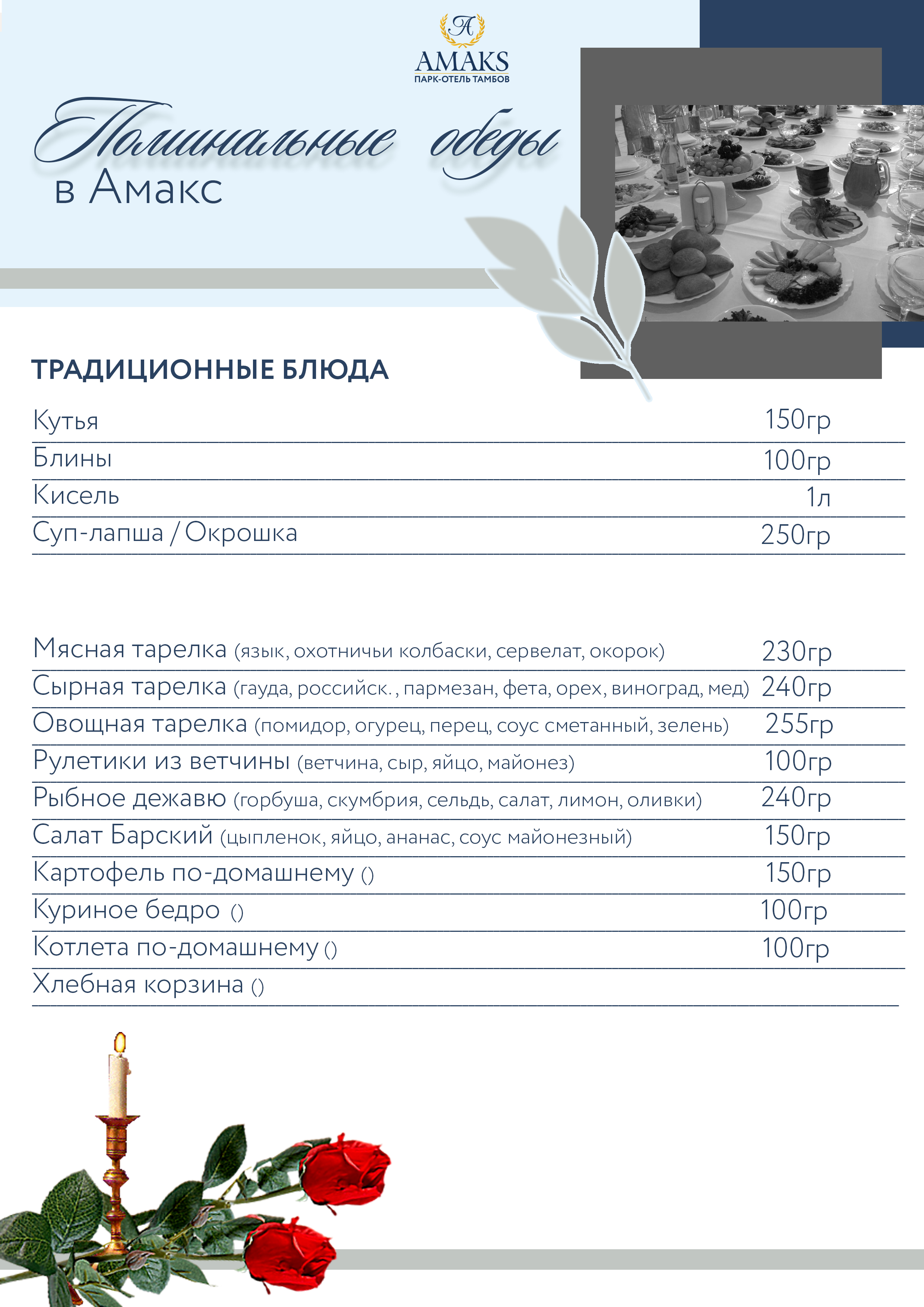 Ресторан "Московский" возьмет на себя все обязательства по организации поминального обеда. Вы сможете достойно проводить в последний путь близкого Вам человека, пока наши специалисты займутся приготовлением поминального стола.